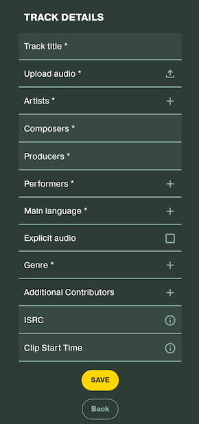 - Once you've uploaded the audio and filled in the track metadata, save it and continue to the next track. Any field with an asterisk (*) is required. If you have your own ISRC codes, you can enter these on each track. Otherwise, leave them blank, and we’ll generate them for you. Be sure to scroll through the whole card, so you don’t miss any fields.