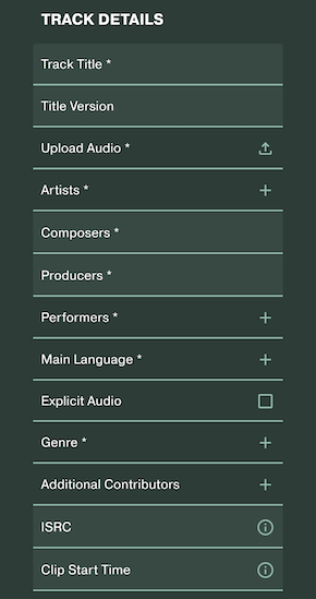 - After completing the release-level metadata, add your first track by clicking the big plus sign (ADD TRACK) in the release page.