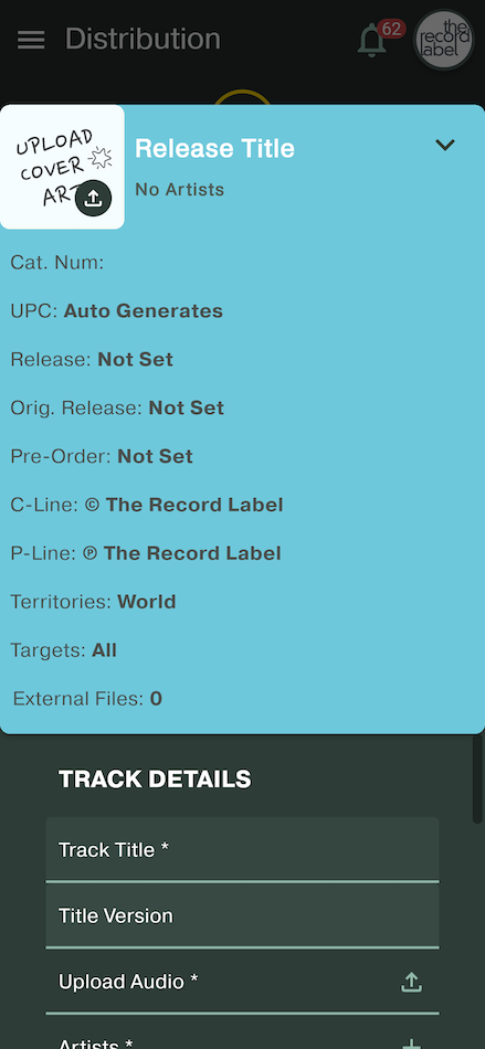 Only record labels (not artist accounts and profiles) can submit a release for distribution. Before proceeding, ensure you're logged in as a record label (identified by a dark green profile, whereas artist profiles are light green).