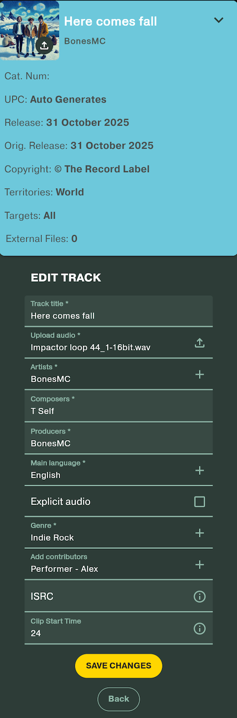 - Once you've uploaded the audio and filled in the track metadata, save it and continue to the next track. Any field with an asterisk (*) is required. If you have your own ISRC codes, you can enter these on each track. Otherwise, leave them blank, and we’ll generate them for you. Be sure to scroll through the whole card, so you don’t miss any fields.