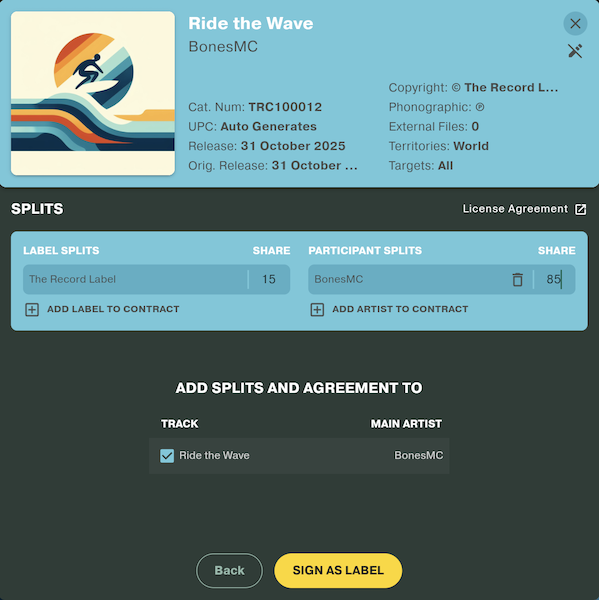 Alternatively, you can use your own licensing an agreement by uploading it and just set up the splits.