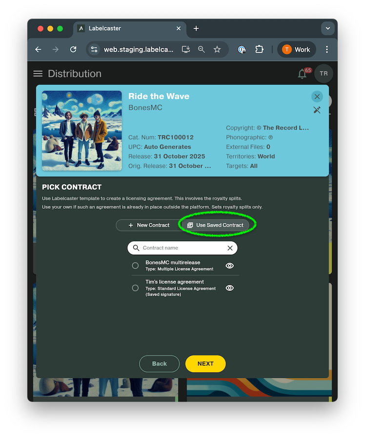 This grants the label the rights to digitally distribute the music and determines how royalties will be split from that distribution. You can use Labelcaster’s template or use your own contract outside of our platform. See Understanding licensing and splits in Labelcaster - If you choose a contract outside of our platform, you’ll need to upload that document to proceed. Otherwise, you can just use the Labelcaster License Template