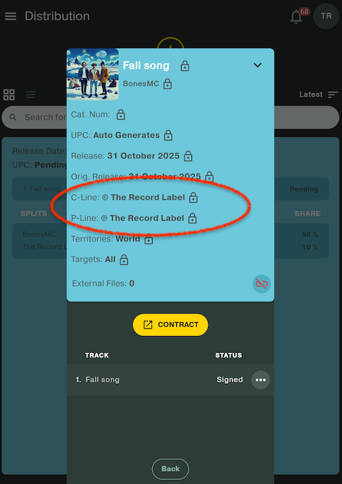 Record labels distributing music must have secured a licensing agreement for distribution rights from the owners. Think of this as the rights holders granting permission for a period of time (like a loan) to commercialize a work, rather than ceding ownership, per se. Labelcaster’s system ensures that all releases have digital distribution licenses and details how the royalties will be split. Labels can upload their own agreement or use our built-in template. All participants must e-sign the agreement before releases can be distributed to DSPs.